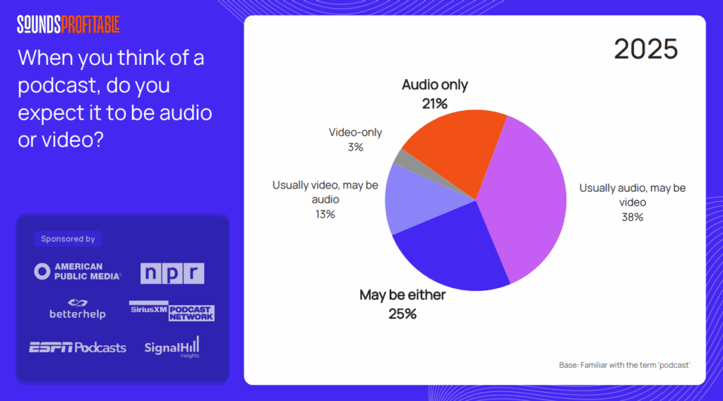 A final takeaway from Sounds Profitable’s Podcasting Landscape report is a growth in public perception that a podcast may be either video or audio.