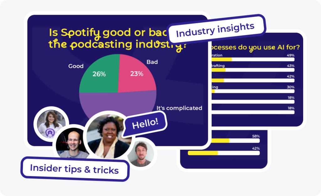 - Industry trends and data insights: We dive deep into emerging industry data, identify new podcast trends, and keep you in the know about new tools and technology entering the industry.