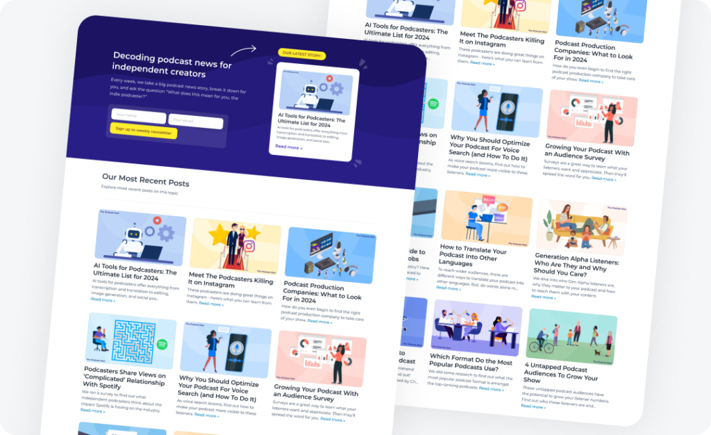 - Podcaster perspectives: We shine a light on the podcasting community with case studies, opinion pieces and podcasting success stories you can learn from.