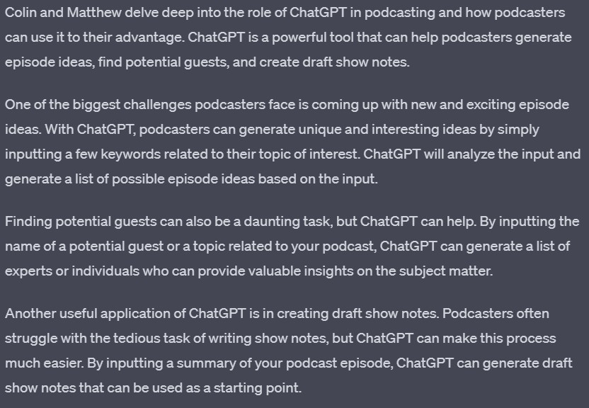 You’ll also still need to do a bit of editing to the draft ChatGPT creates for you. It would be bad practice to copy and paste this right into your show notes field without putting a bit of your own spin on it first. But it’s undoubtedly a huge helping hand for folks who hate writing show notes, or just hate writing in general.