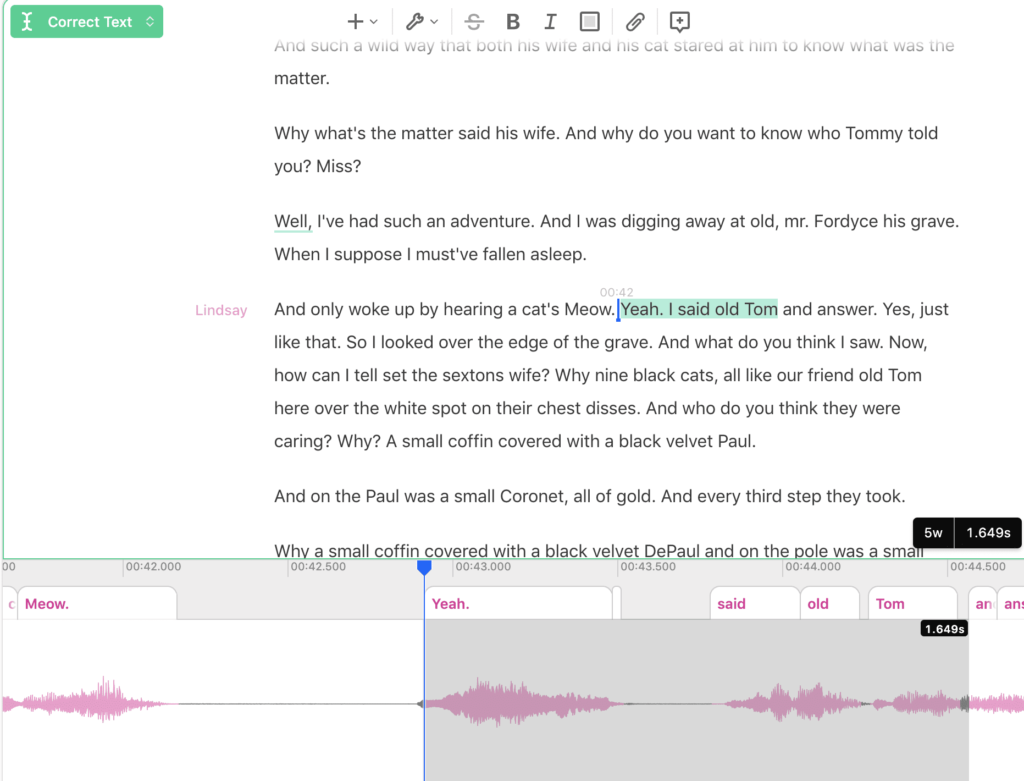 Since Descript’s editing process is text-based, transcription is the first step after recording your audio or video files. The transcripts are fairly accurate, but correcting the audio recordings is easy if necessary. Just click on the word you want to fix, select “Correct,” and type in the right word.