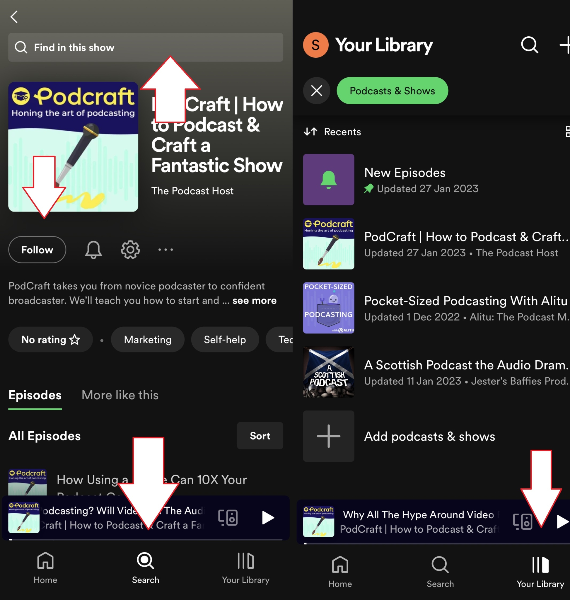 - To listen, tap ‘Your Library’ > ‘Podcasts and courses’, and choose a show to start playing.