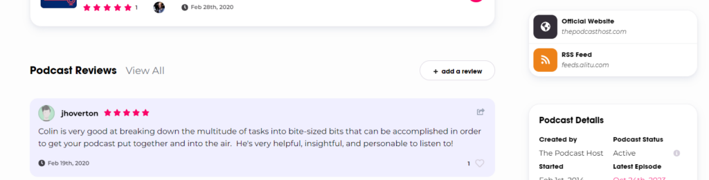 If you’re struggling to find a podcast’s own webpage, then try searching for it on Podchaser. You’ll find a link to the RSS feed by scrolling down the page – it’s on the right-hand side above “Podcast Details”.