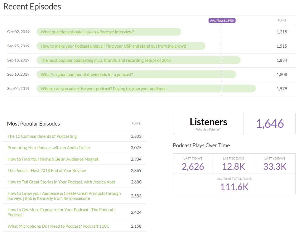 To pick out a few of the more unique features, the design is one standout point, to start with. As with the rest of the Buzzsprout dashboard, the stats look simply lovely. Well laid out, nicely presented, and super clear. I like how they have your most recent five episodes, right up top, and then most popular episodes below that.
