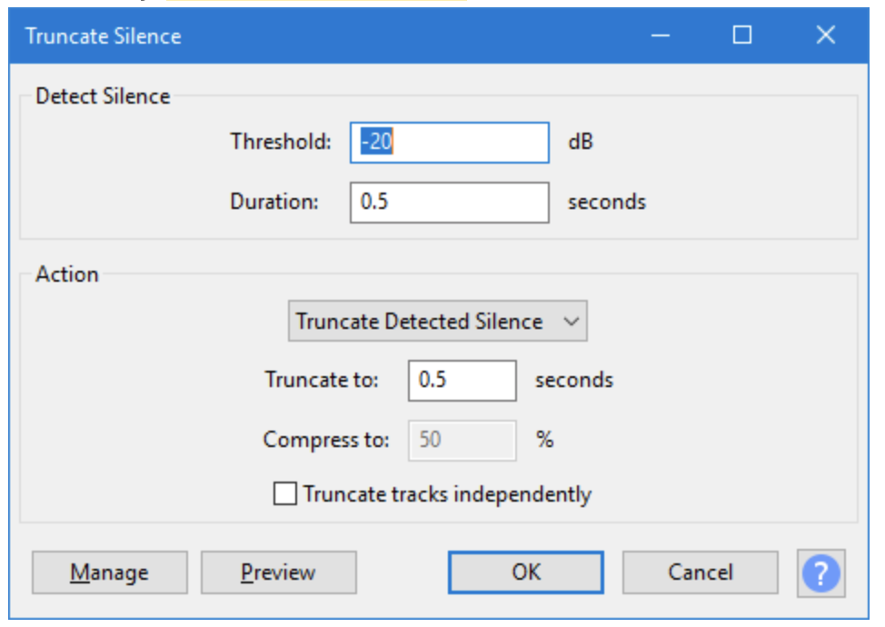 In Audacity, the process is called “truncate silence,” and it’s similar. Select Effects in the top bar, and pull the menu down to “Truncate Silence.” A window pops up with options to change the decibel threshold and the length of time for pauses.