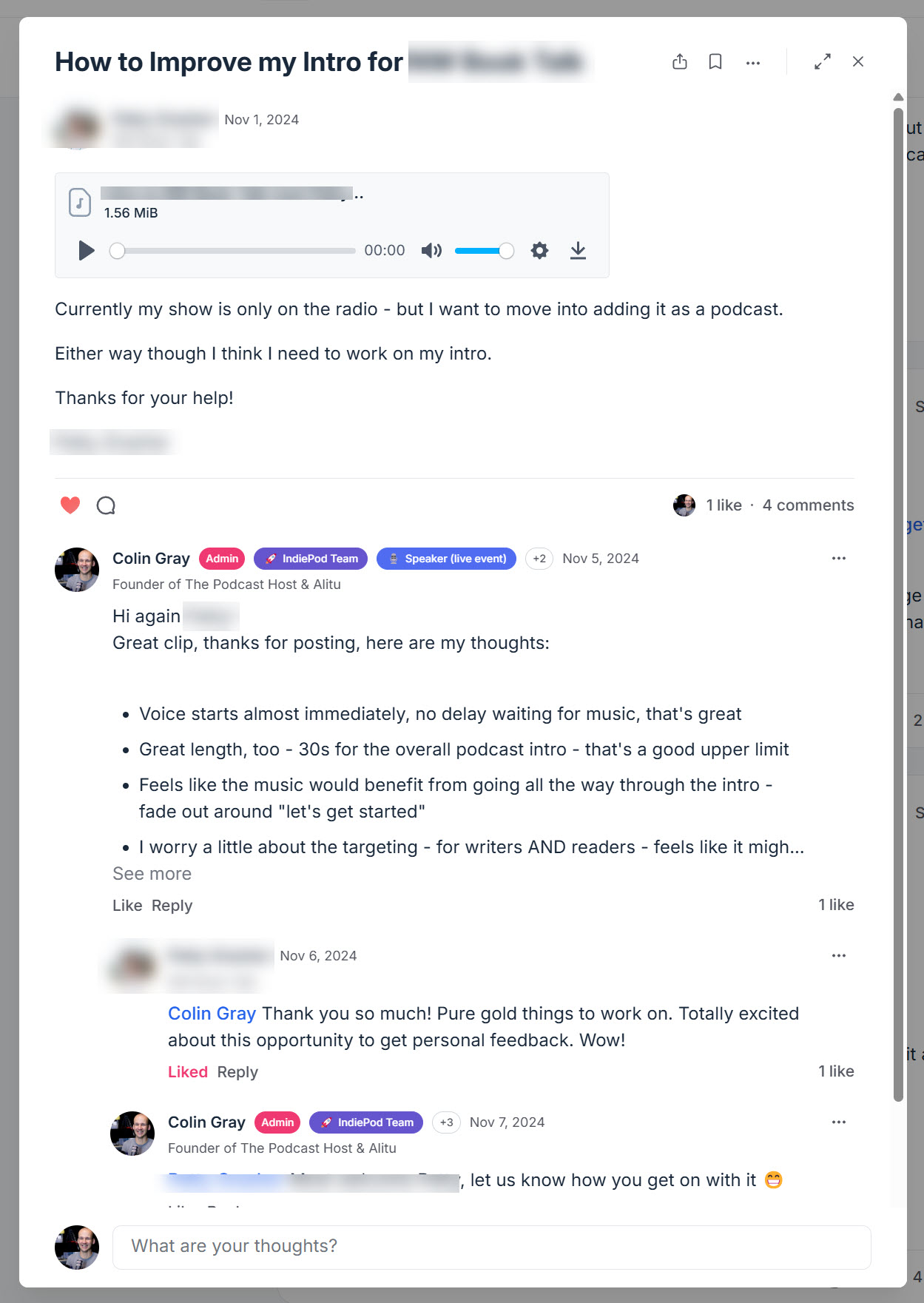 The power of this is little and often. Pick a really specific part of your show - your intro, your interview questions, your ad-reads - and ask for specific feedback on them.